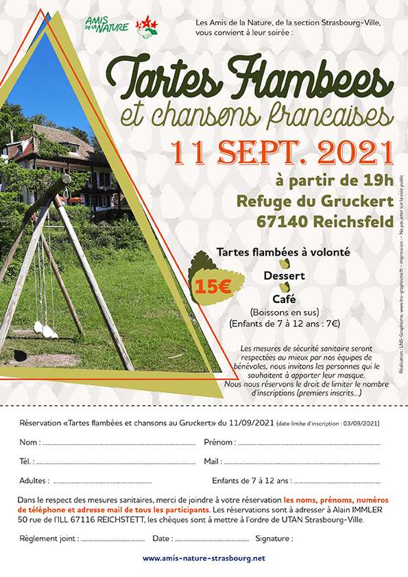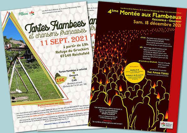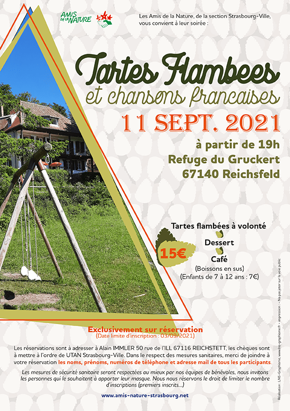 Une première pour la traditionnelle soirée tarte flambées et chansons françaises. Une fois encore cette affiche se décline en deux versions, une avec formulaire d’inscription et une sans. Pour cet événement, il est toujours souhaité de mettre une photo du refuge où la soirée prend place, c’est la seule consigne qu’on me donne.