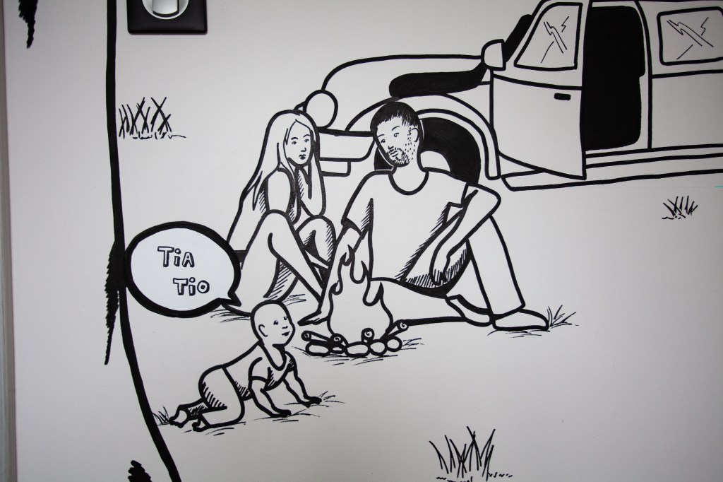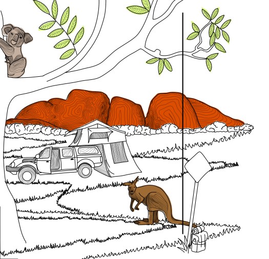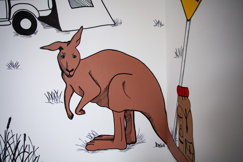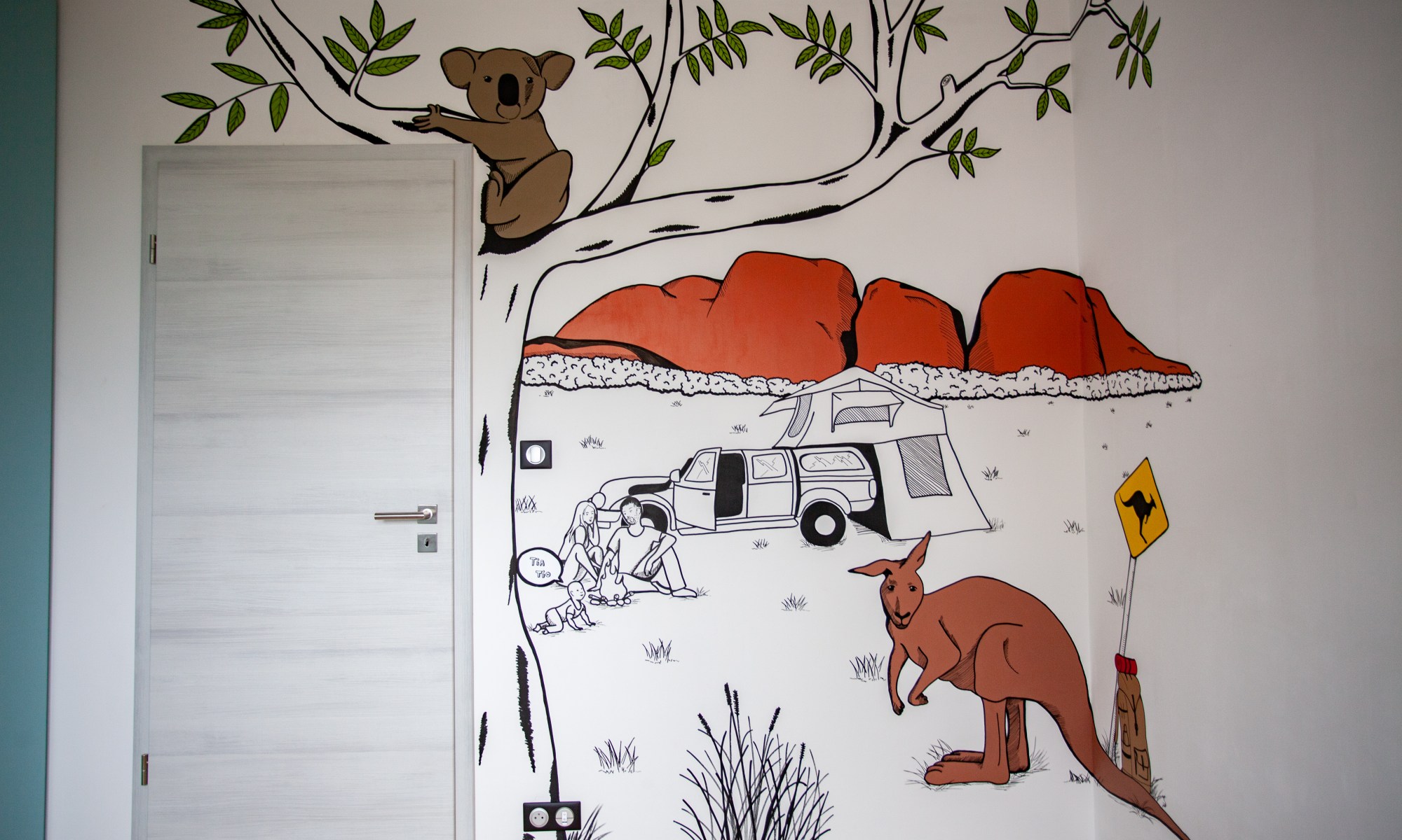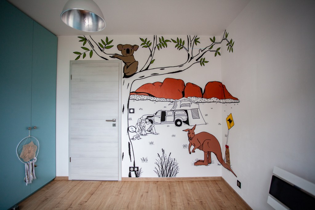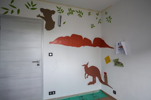 Cette fois, c’est pour une fresque surprise que l’on m’a appelée. La demande : une fresque pour une chambre d’ami destinée à ses principaux occupants ; la fille cadette des propriétaires pour ses week-ends en Alsace et le petit-fils pour ses séjours chez papy et mamie. Le thème : l’Australie, et plus précisément la rencontre de la jeune femme et de son chéri lors d’un road trip à Kata Tjuta. Le défi : faire un dessin qui plaira autant à des adultes et des enfants, pour un couple de commanditaires pas tout à fait d’accord entre eux sur le style.