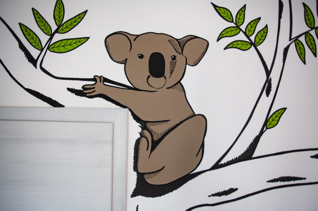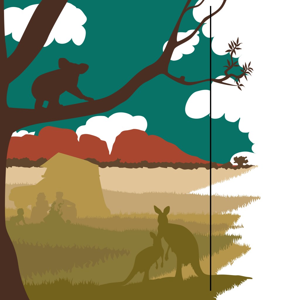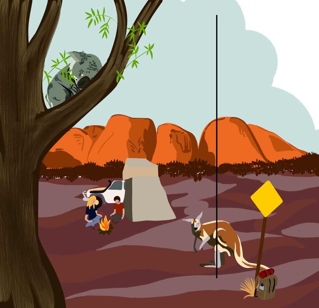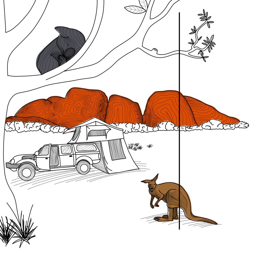 Cette fois, c’est pour une fresque surprise que l’on m’a appelée. La demande : une fresque pour une chambre d’ami destinée à ses principaux occupants ; la fille cadette des propriétaires pour ses week-ends en Alsace et le petit-fils pour ses séjours chez papy et mamie. Le thème : l’Australie, et plus précisément la rencontre de la jeune femme et de son chéri lors d’un road trip à Kata Tjuta. Le défi : faire un dessin qui plaira autant à des adultes et des enfants, pour un couple de commanditaires pas tout à fait d’accord entre eux sur le style.
