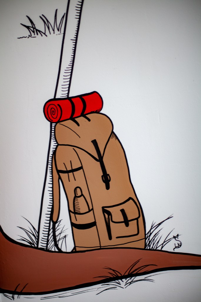 Une fois les couleurs posées, j’ai repris mon crayon pour tracer plus en détails les différents éléments. Nous avons alors décidé d’ajouter des personnages, puis une bulle avec du texte. Un élément après l’autre, j’ai alors tracé les contours et quelques lignes de détails. Pour cette fresque, je n’ai pas eu un gros travail de peinture, c’est avec des feutres à peinture que j’ai réalisés la plus grande partie de la fresque (tout le noir). Le dessin a encore évolué en cours de réalisation, c’est en voyant les couleurs et les traits sur le mur qu’on voit le mieux ce qu’il faut faire pour le meilleur résultat.