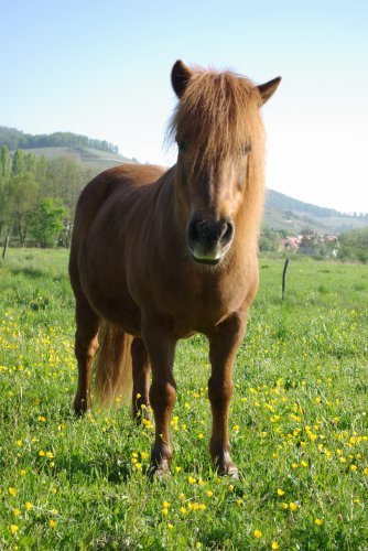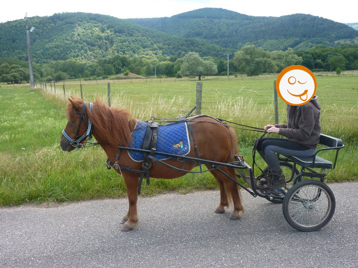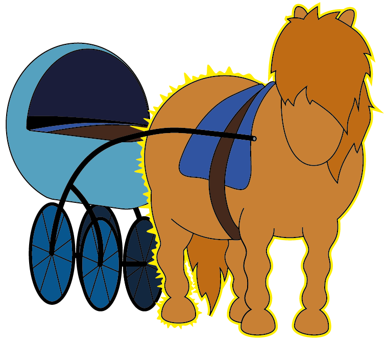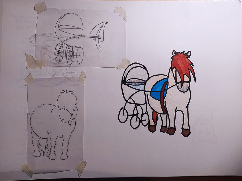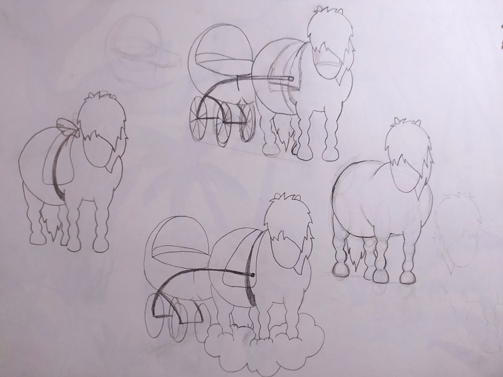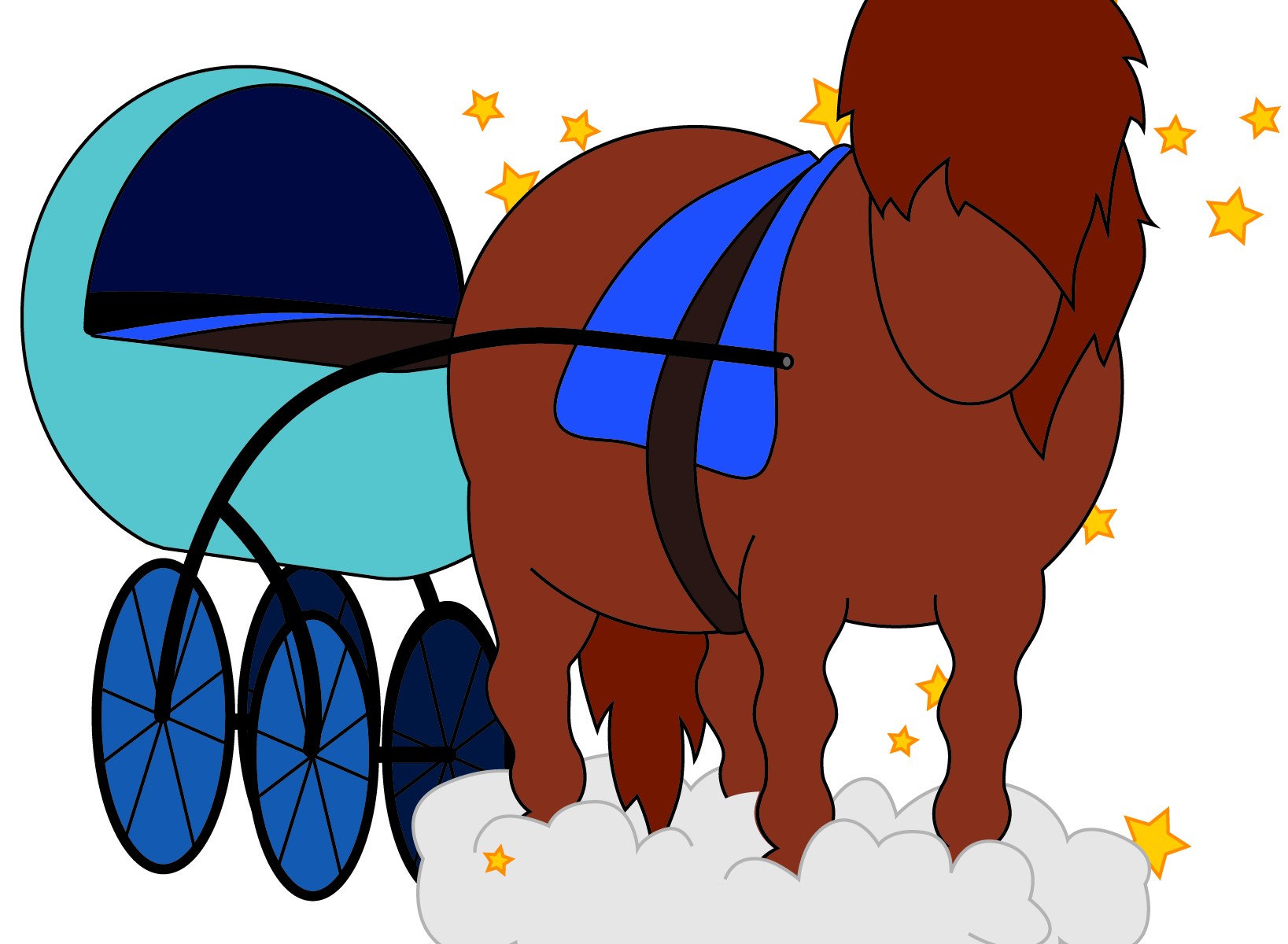 On m’a demandé de créer une illustration pour l’arrivé du petit Ezio. Manon souhaitait offrir à la future maman une couverture avec une illustration représentant le poney avec qui elle a grandi, pour qu’il veille toujours sur le bébé de son ami. En regardant les photos de la future maman et de son poney, je l’ai vu sur son sulky faisant une balade avec Noisette (le poney). J’ai donc eu l’idée de prendre cette photo comme modèle et de remplacer le Sulky par un landau.