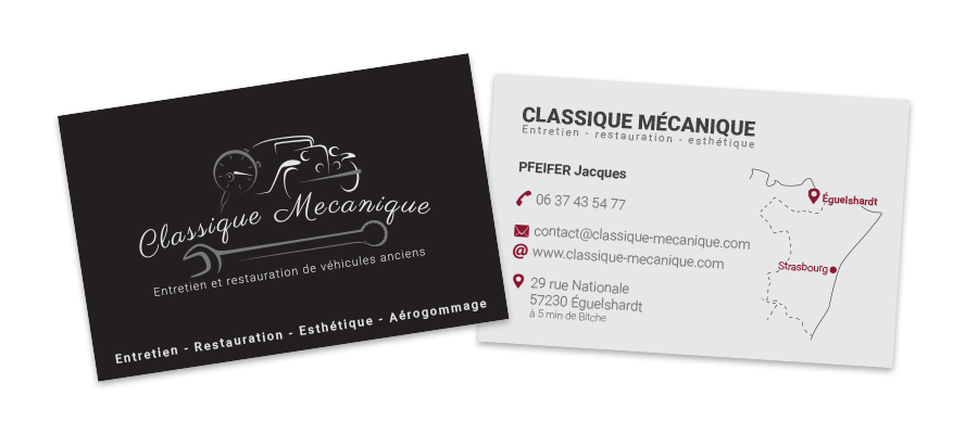 Suite à la validation du logo, nous avons encore travaillé ensemble pour la réalisation de cartes de visite et sur un shooting photos au garage pour étayer son site internet : classique-mecanique.com
